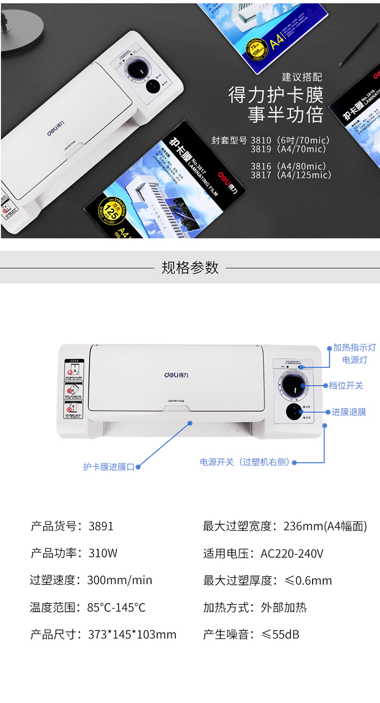 得力(deli) 3891 適用A4靜音設(shè)計(jì)時(shí)尚簡潔塑封機(jī)/過塑機(jī) 雙向電機(jī) 灰色