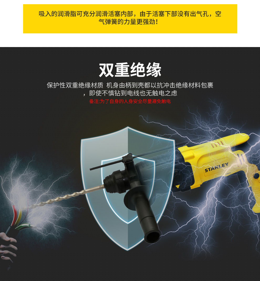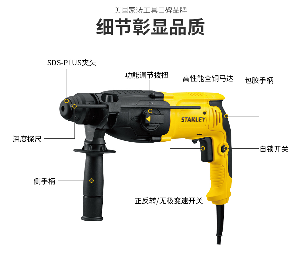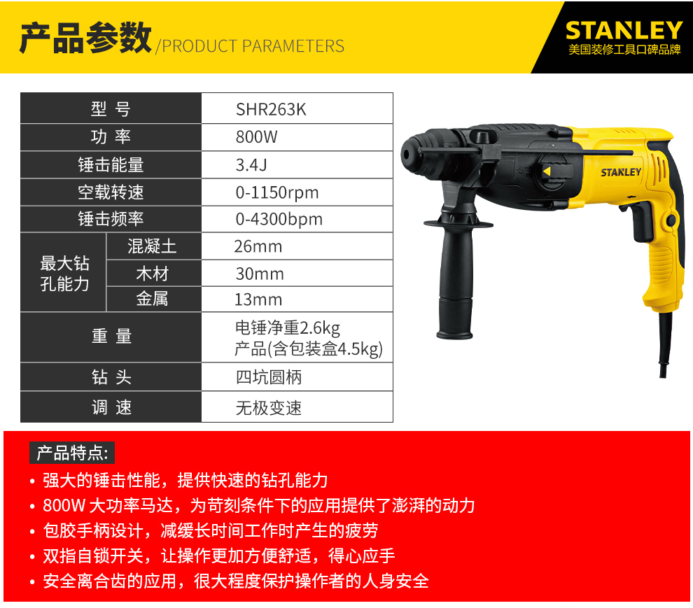 Stanley史丹利電錘 多功能沖擊鉆電錘電鎬三用800w大功率 正反轉(zhuǎn)電鉆 混凝土輕型 800w多功能電錘 SHR263K-A9