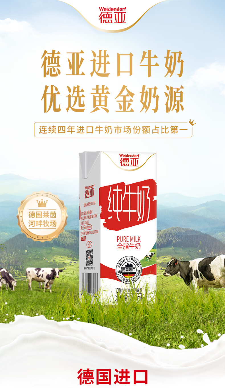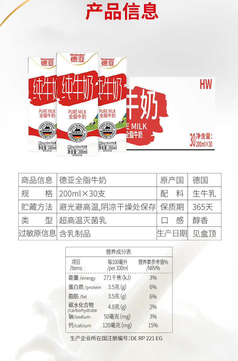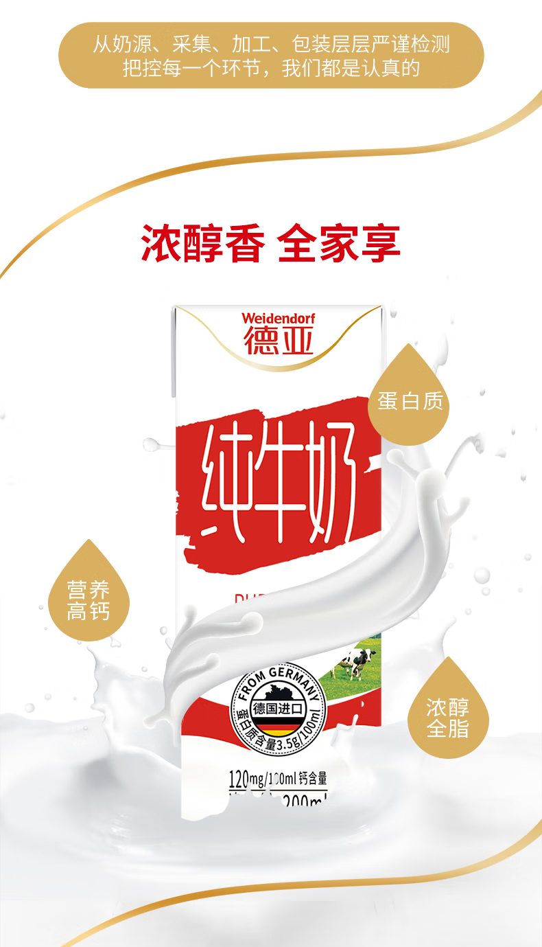 德亞(Weidendorf) 德國進口牛奶德亞(Weidendorf)全脂純牛奶早餐奶200ml*30盒整箱裝(新老包裝隨機發(fā)貨)