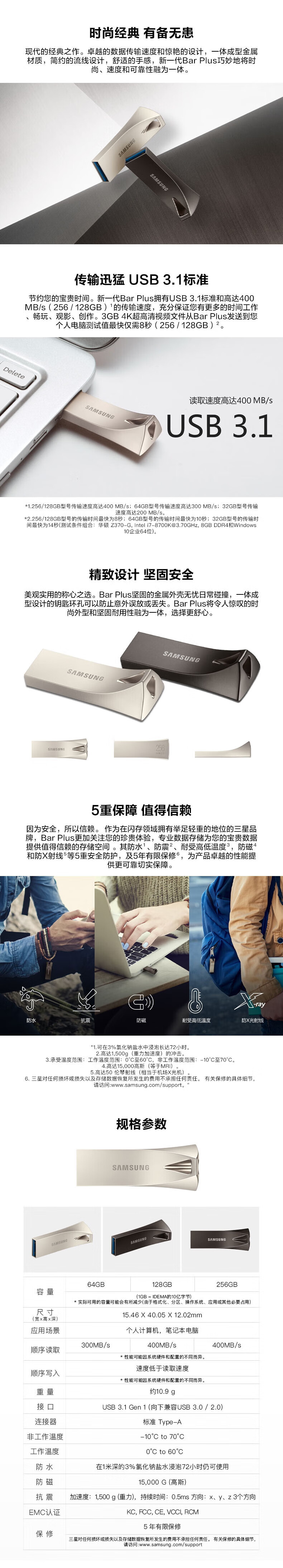 三星(SAMSUNG ) 128GB USB3.1 防水高速讀寫U盤金屬外殼 BAR升級版+ 讀速400MB/s 移動優(yōu)盤(Gen 1)香檳銀